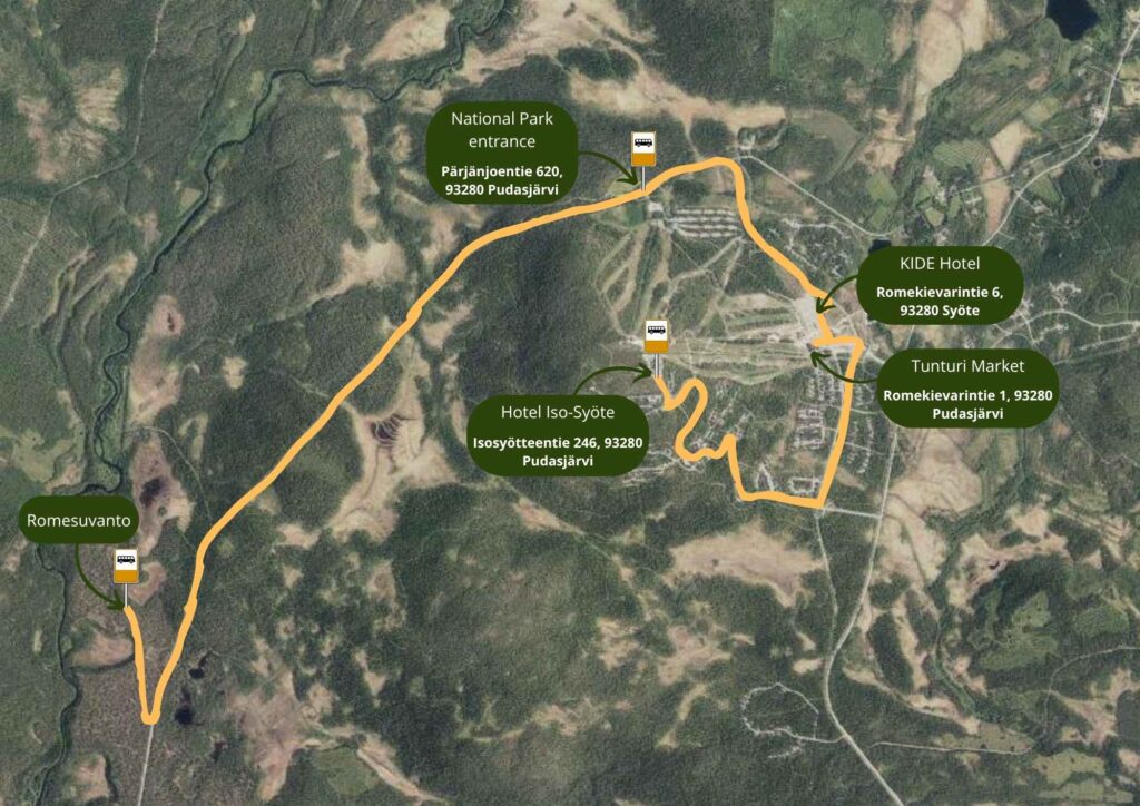 | Hotel Iso-Syöte | On the hour, last bus at 18:00 |